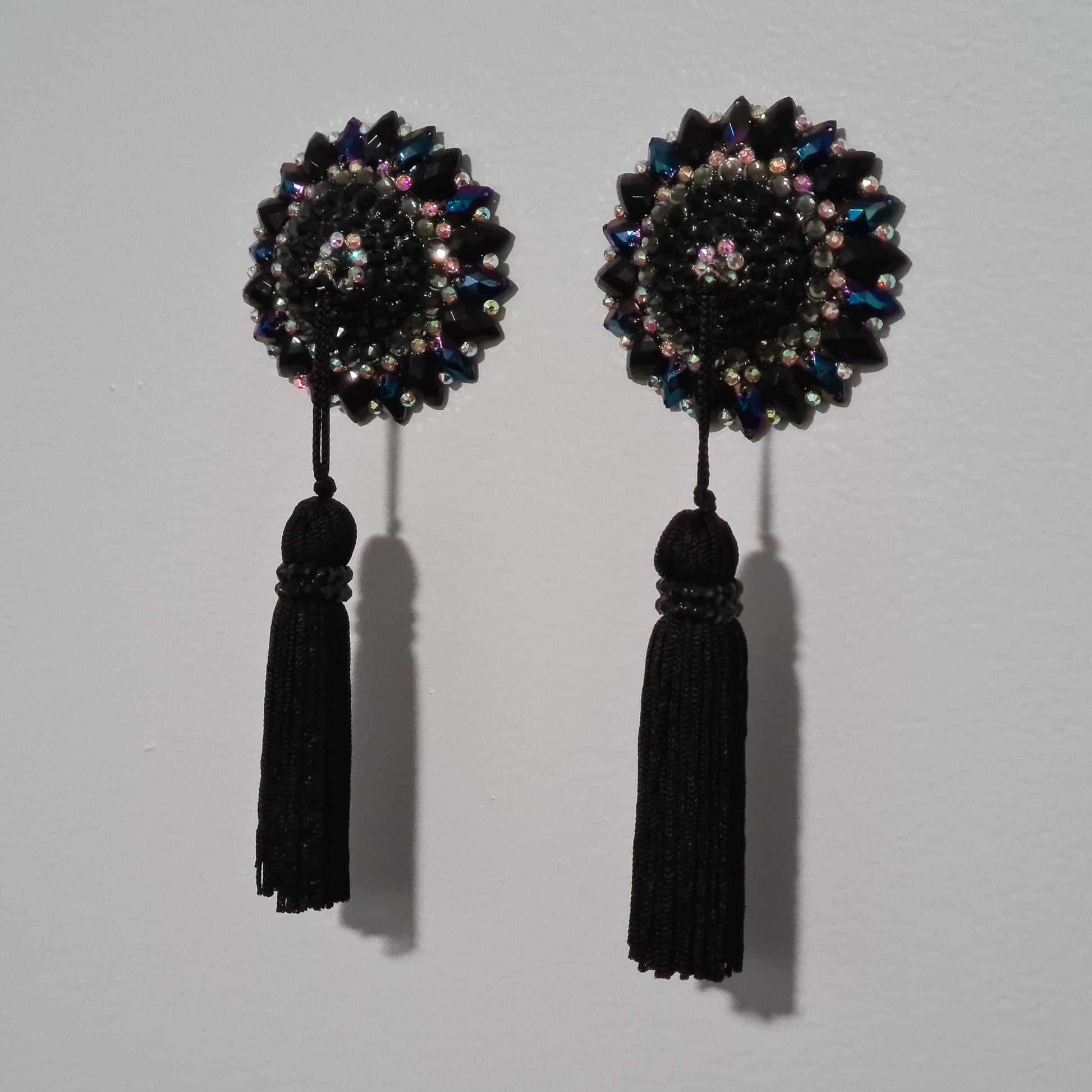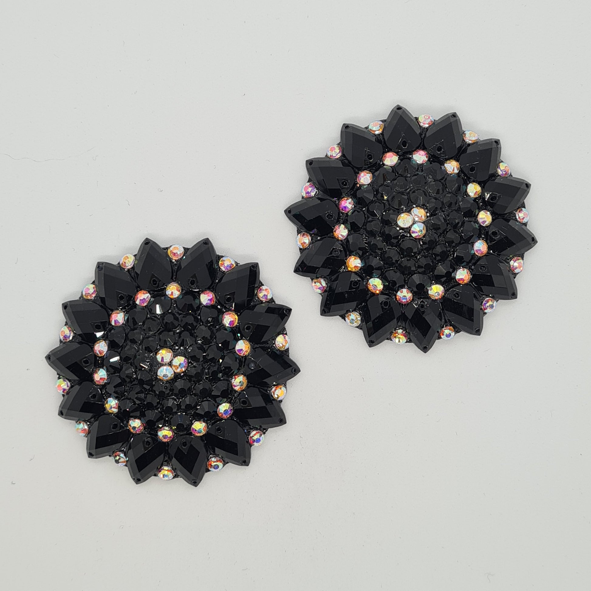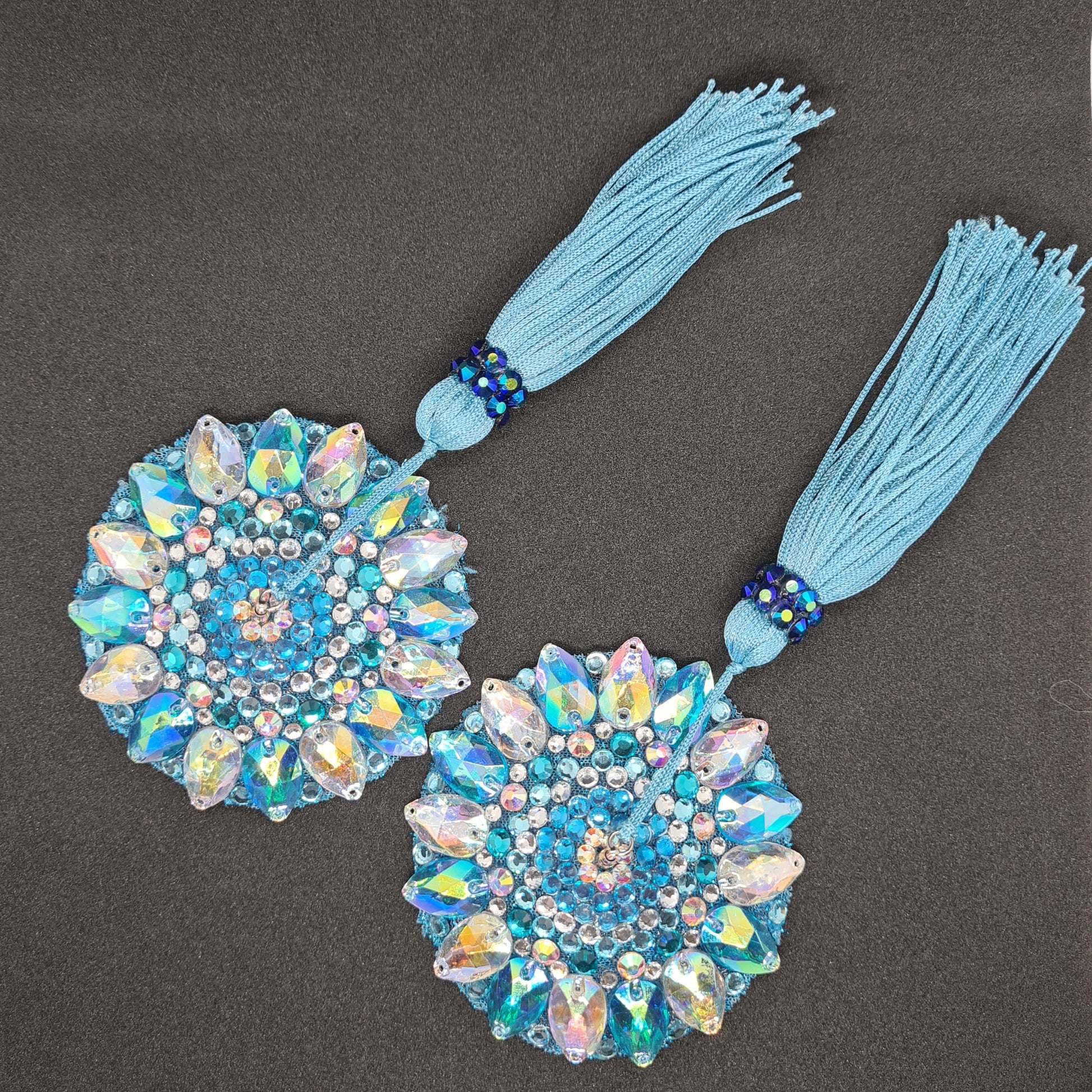 These pasties will have a base colour and encrusted in glass rhinestones of multiple sizes (SS12-30) and acrylic teardrop shapes or upgrade to glass teardrop shapes (for additional $20).